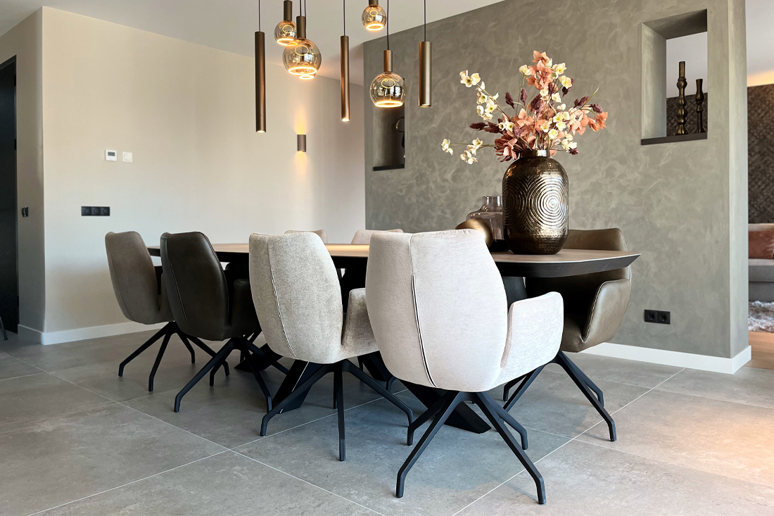 Kies dan eetkamerstoelen die een brug slaan tussen beide stijlen. Bijvoorbeeld, als je een moderne tafel hebt in een klassiek interieur, kies dan voor stoelen met klassieke vormen maar in moderne materialen zoals metaal of kunststof. Het belangrijkste is dat er één verbindend element is tussen tafel, stoelen en interieur.
