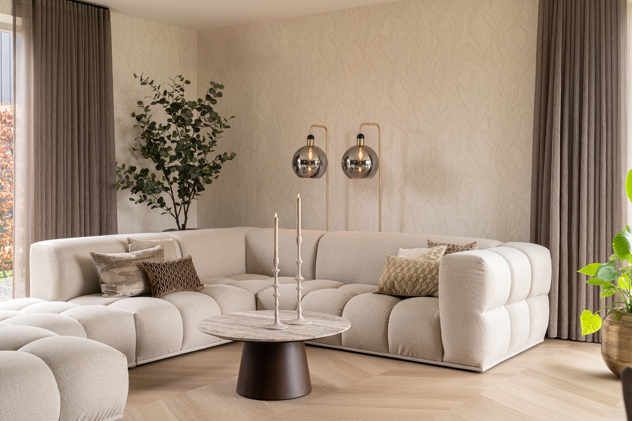 De beige hoekbank vormt het hart van deze woonkamer en zorgt meteen voor een rustige, warme uitstraling. Dankzij de zachte tint laat hij de ruimte groter en lichter aanvoelen, terwijl hij tegelijkertijd uitnodigt om lekker neer te ploffen. In combinatie met de andere natuurlijke materialen ontstaat er een sfeervol geheel waar comfort centraal staat.