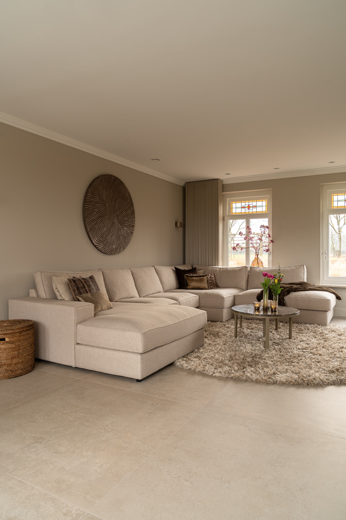 Deze woonkamer straalt rust en verfijning uit vanaf het eerste moment. De lichte basis zorgt voor een frisse uitstraling, terwijl warme accenten juist voor extra gezelligheid zorgen. Verschillende materialen vullen elkaar moeiteloos aan en brengen diepte in het geheel. Een ruimte die perfect in balans is en uitnodigt om heerlijk te ontspannen.