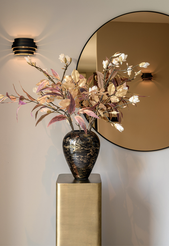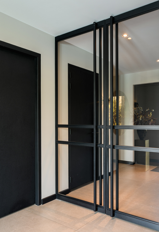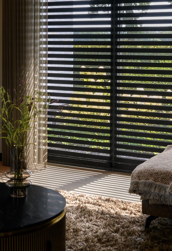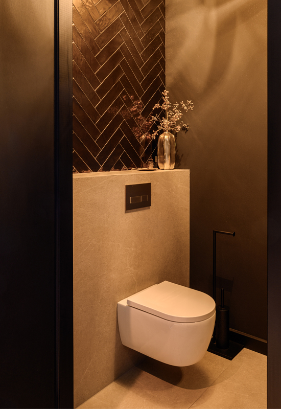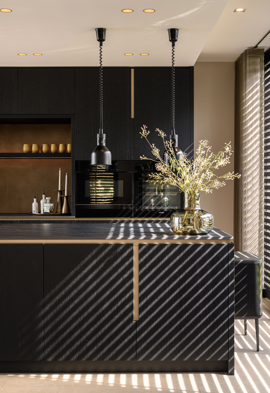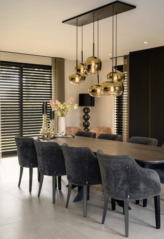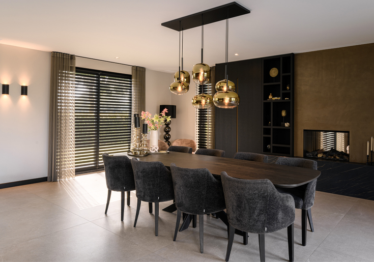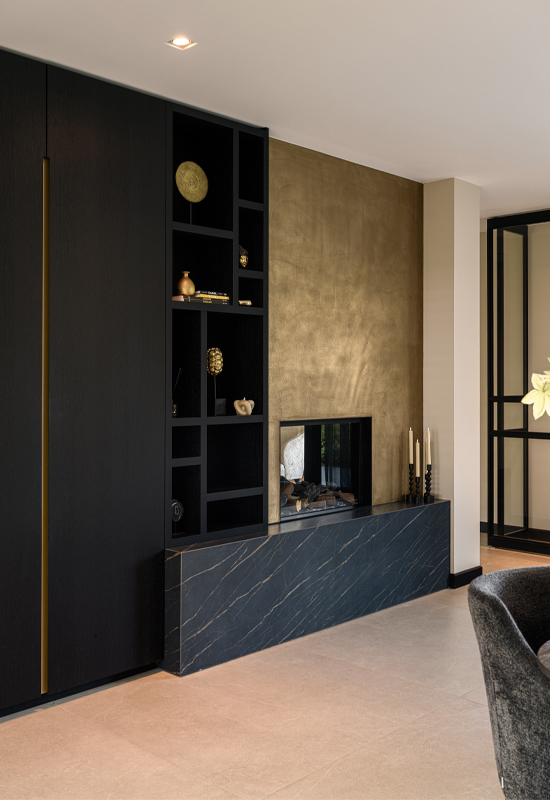 Binnen in deze villa ontvouwt zich een interieur dat warmte, luxe en harmonie ademt. De entree leidt niet naar een traditionele opstelling, maar naar een dynamisch hart waarin de woonkamer het stralende middelpunt vormt. Hier spelen zichtlijnen, balans en verrassing subtiel samen. De inrichting is opgebouwd uit diepe zwarte accenten, warme goudtinten en zachte beige nuances, aangevuld met vergrijsd eiken en natuursteen. Deze combinatie creëert een hotelchique sfeer die tegelijk intiem en persoonlijk blijft, waarbij elk detail – van een metalen plafond tot glitterende elementen – het geheel versterkt.