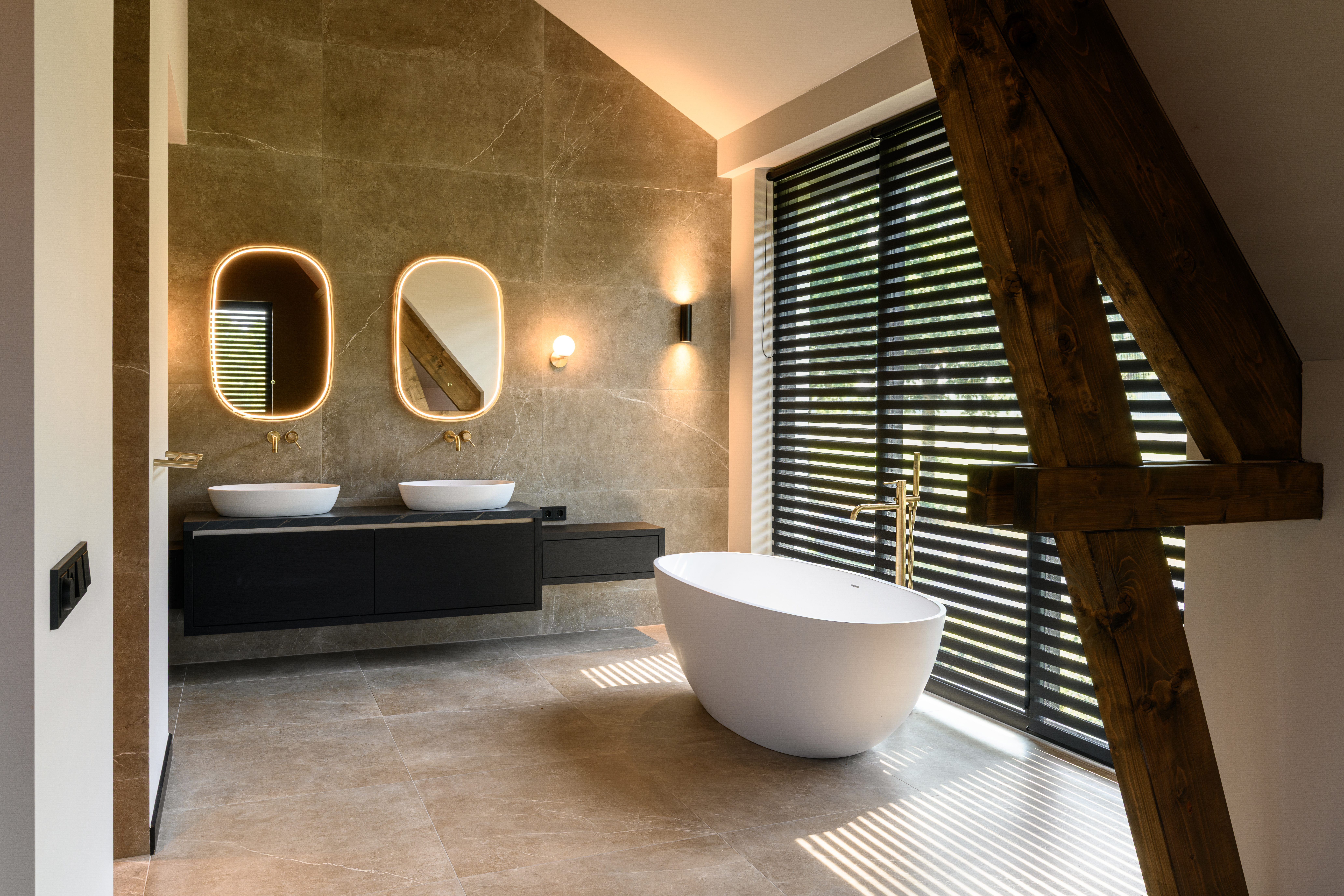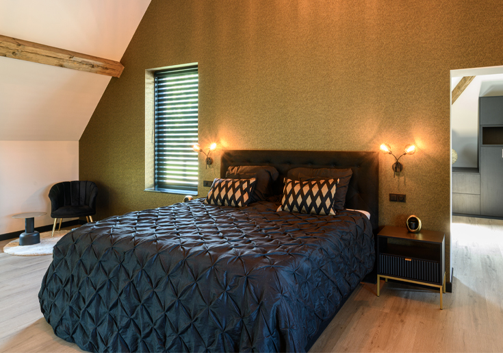 De master suite is ontworpen als een serene retraite. Structuurbehang, houten jaloezieën en vergrijsd eiken brengen rust en geborgenheid, terwijl de ensuite badkamer met vrijstaand bad een vleugje luxe toevoegt. De inloopkast vormt samen met de badkamer een perfect ingedeelde privésuite, praktisch én stijlvol. In de achterste vleugel van de villa biedt een zelfstandig appartement dezelfde warme sfeer, ideaal voor logees of familie. Het geheel wordt gedragen door de signatuur van Van Hooft Architecten: tijdloos, karaktervol en doordacht tot in elk detail. Een woning met een ziel—ontstaan uit een droom, gerealiseerd met liefde voor het leven dat erin wordt geleid.