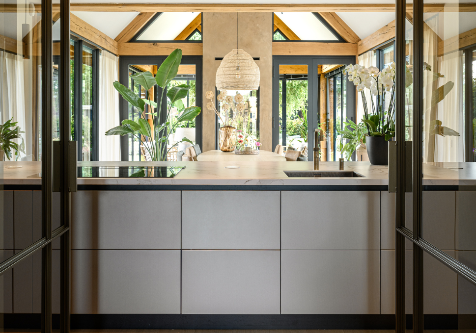 Centraal in de woning ligt de open keuken, waar het leven zich afspeelt. Een grote eettafel van drie meter lang dwars op het kookeiland staat, is het middelpunt. De keuken is ruim opgezet, plafondhoge keukenkasten zorgen voor rust en overzicht. De koffiecorner direct naast de keuken vind je in de bijkeuken, met een groot werkblad, veel kastruimte en een deur naar buiten waardoor de auto onder de overkapping geparkeerd staat. Zo kun je heel gemakkelijk je boodschappen uitladen en opbergen in de bijkeuken. Handig, logisch en comfortabel.