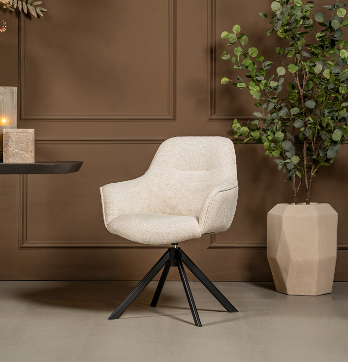 Ten eerste heeft Lara een tijdloze, moderne uitstraling die moeiteloos past in verschillende woonstijlen. In de eerste plaats komt dat door de elegante ronde vormen en de hoogwaardige afwerking. Verder zorgt het metalen onderstel voor stabiliteit en een luxe uitstraling. Ten slotte geeft de zachte stoffering de stoel een comfortabele en warme look.