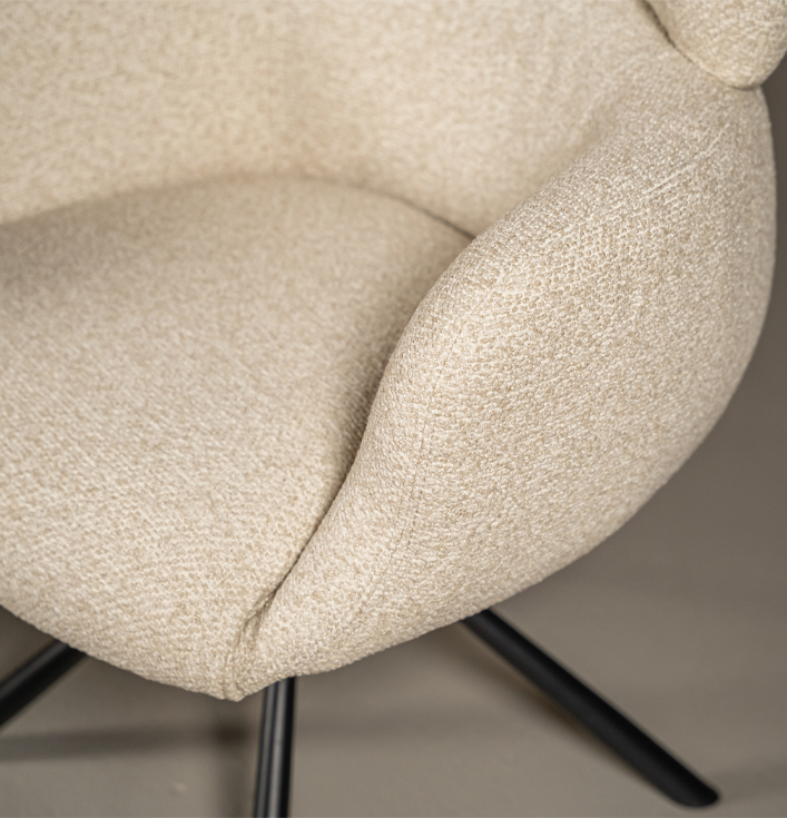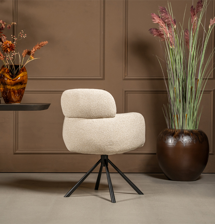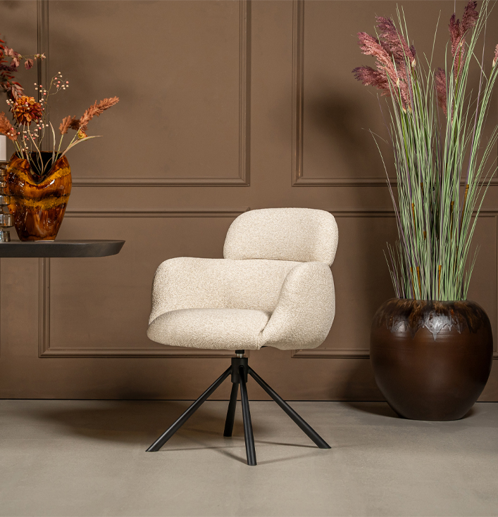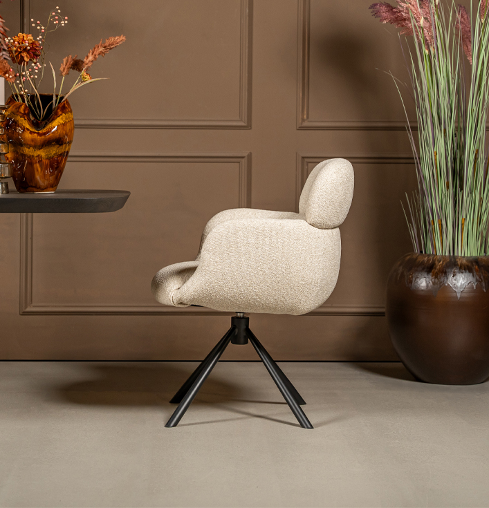 Ten eerste valt Layla op door haar zachte vormen en luxe uitstraling. In de eerste plaats komt dit door de dikke, gewatteerde bekleding. Verder zorgt het zwarte metalen onderstel voor een modern contrast, wat de stoel extra karakter geeft. Ten slotte maakt de draaifunctie de stoel praktisch én gebruiksvriendelijk.