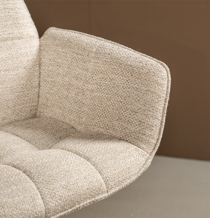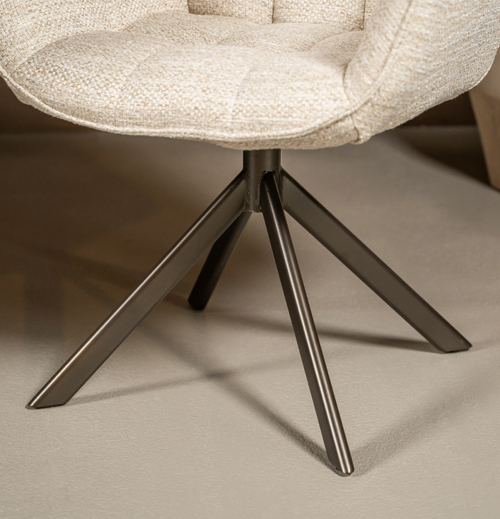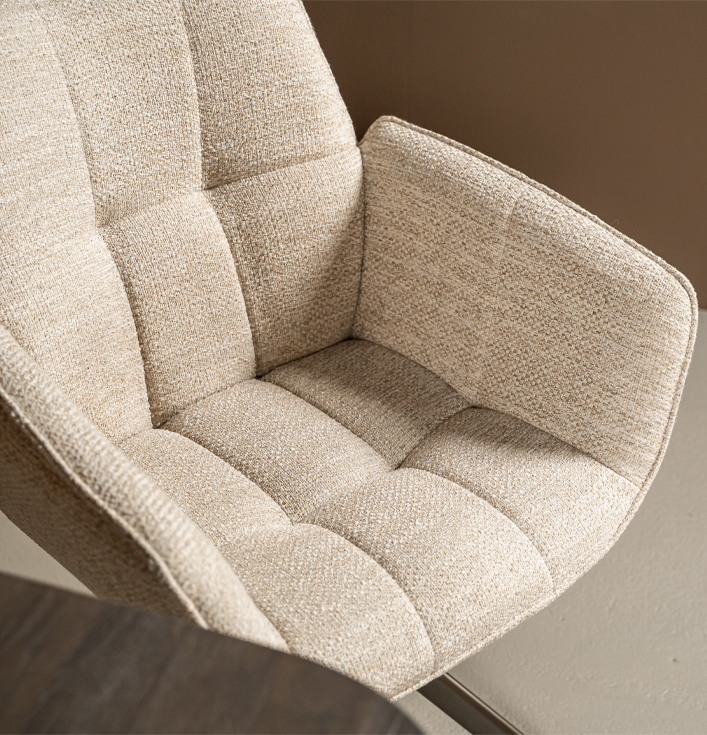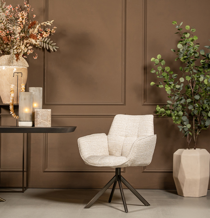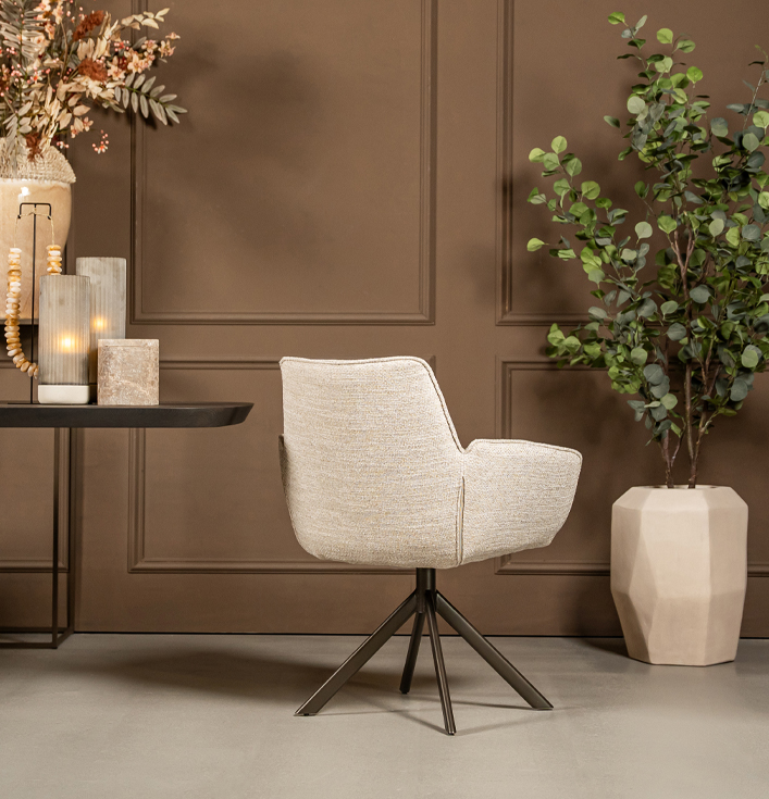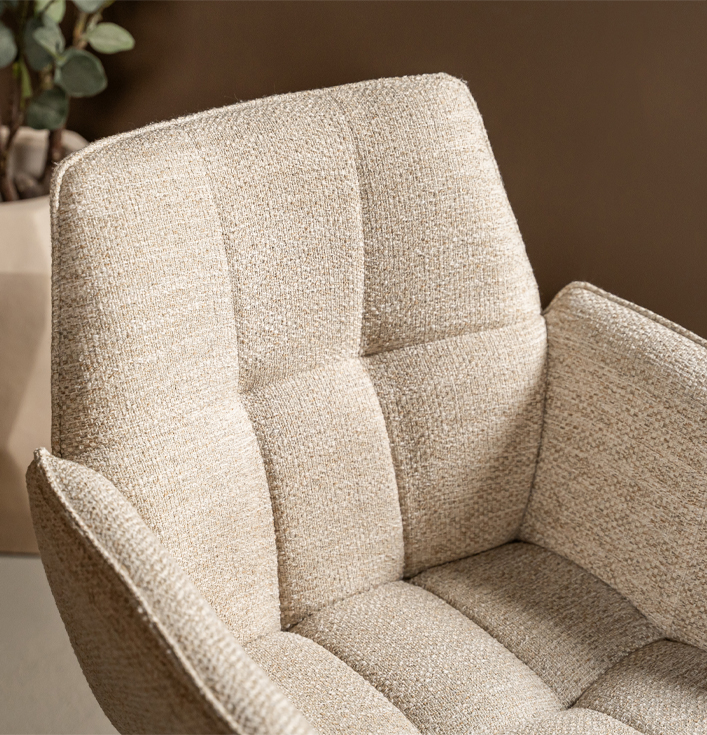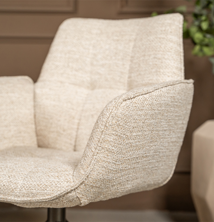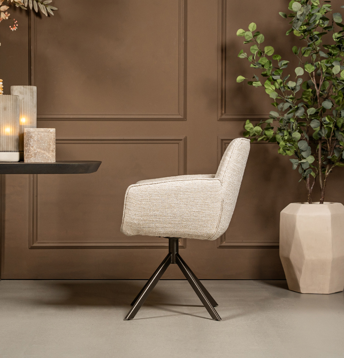 De ronde vormen van de Eetkamerstoel Marseille voelen zacht en luxueus aan, net zoals premium hotelinterieurs. Daarnaast is de draaifunctie bijzonder praktisch, want hierdoor beweeg je soepel aan tafel zonder de stoel te verschuiven. Dit maakt de stoel ideaal voor zowel dagelijks gebruik als lange, gezellige avonden tafelen.