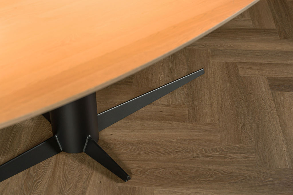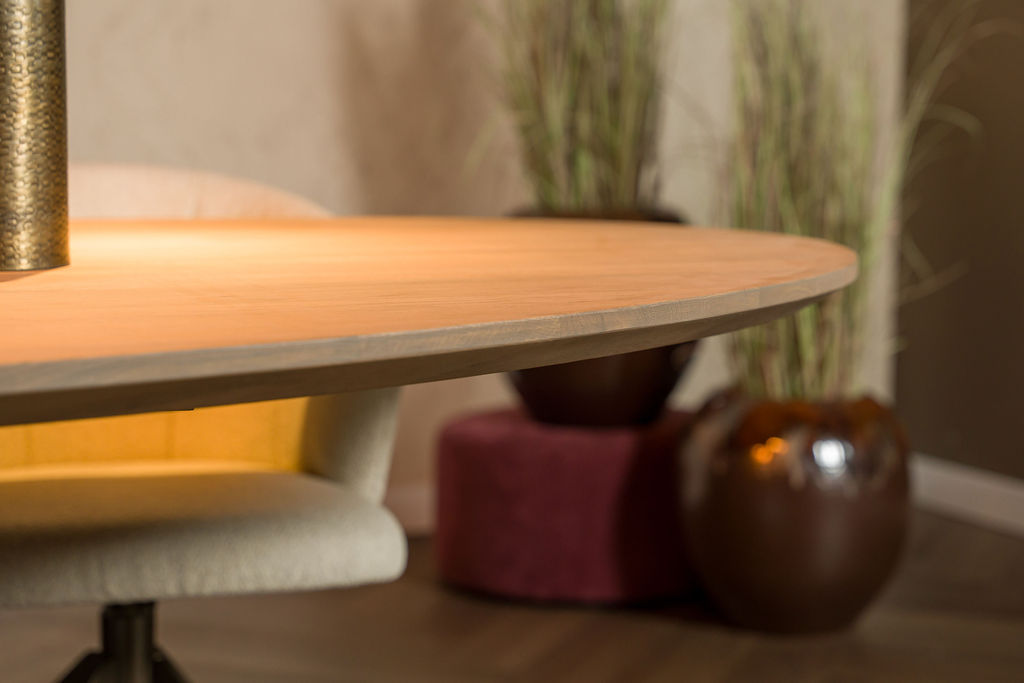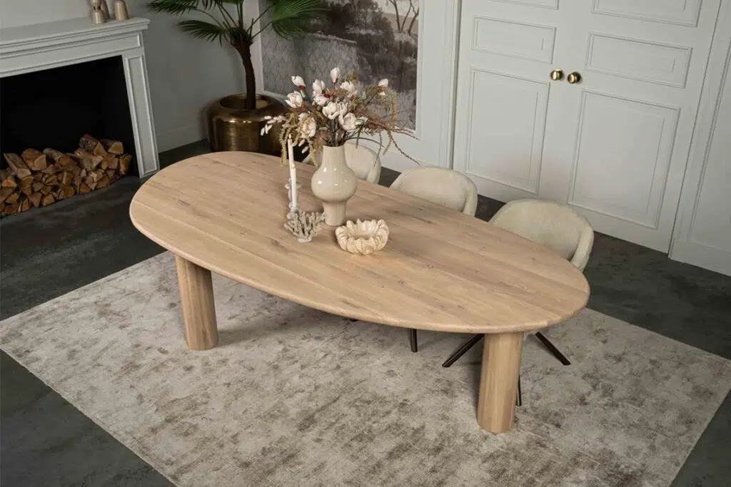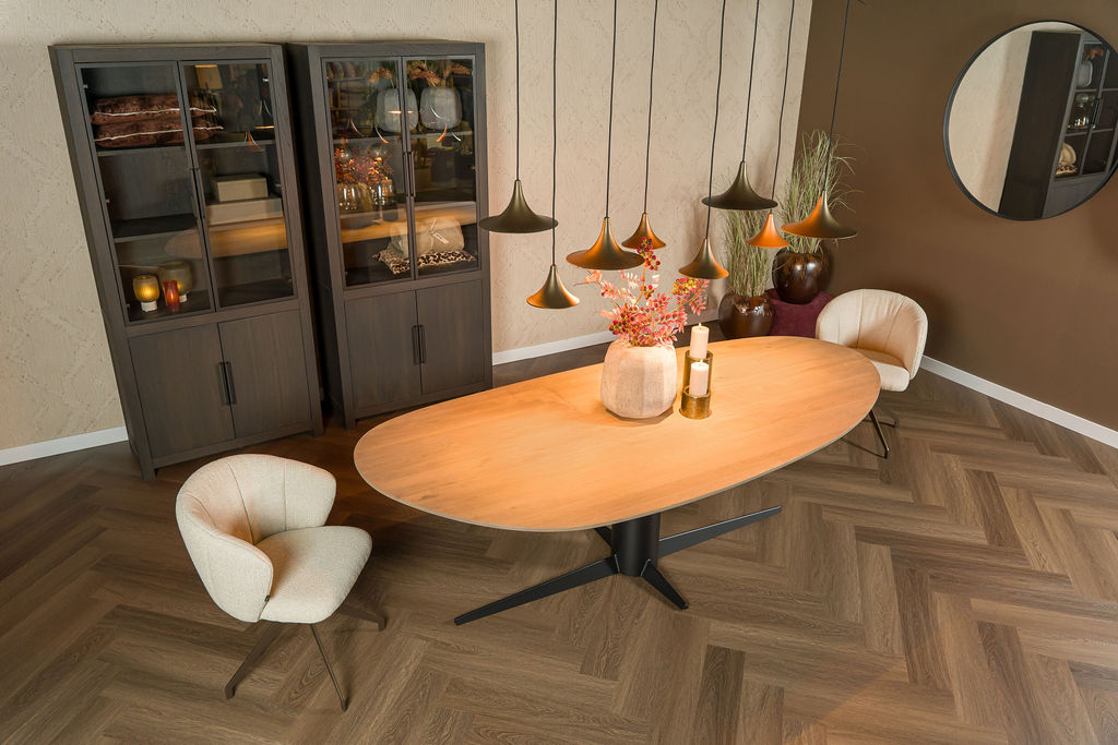 Ten eerste valt deze tafel op door haar ovale blad en verfijnde afwerking. Daarnaast zorgen de stevige poten met hun moderne, kruisvormige onderstel voor een stabiele basis met een eigentijdse uitstraling. Bovendien past het natuurlijke hout perfect in uiteenlopende interieurstijlen: van modern tot industrieel en van landelijk tot Scandinavisch.