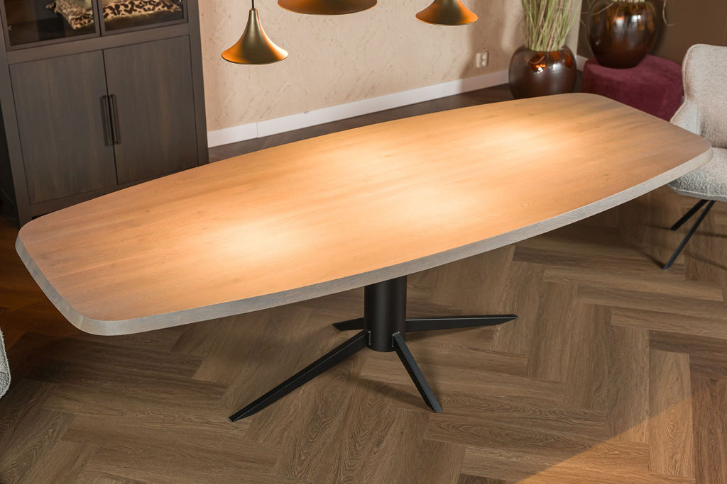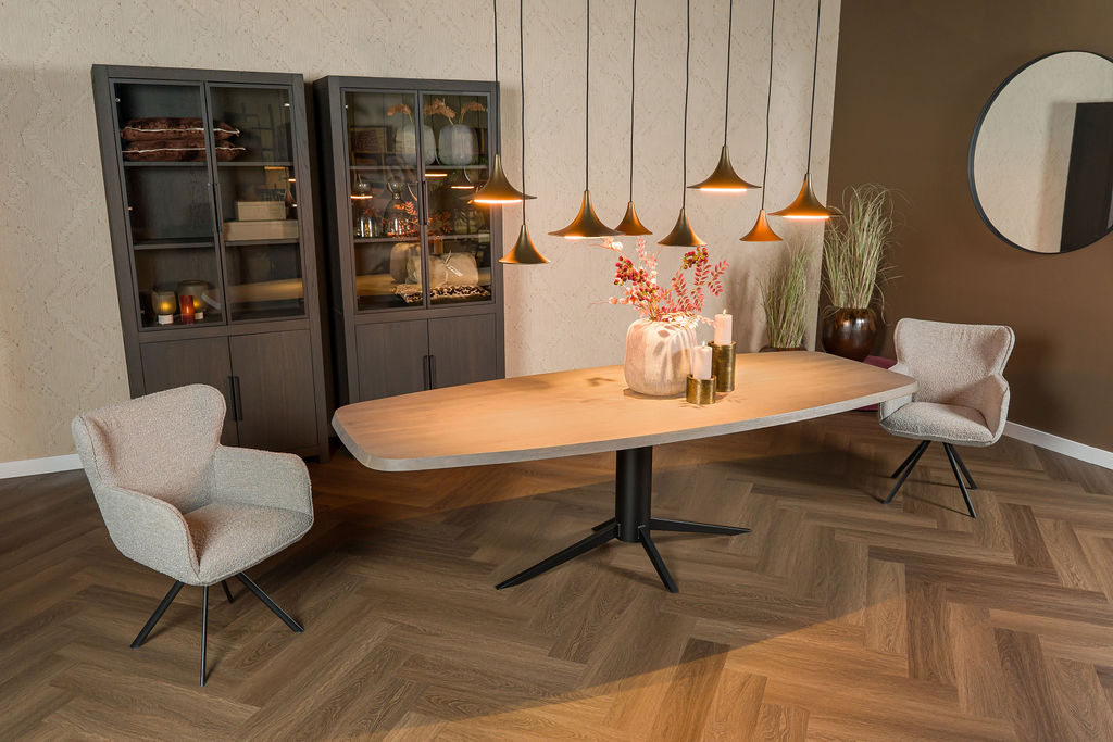 Ten eerste valt het ovale blad direct op: de zachte lijnen geven de tafel een verfijnde, harmonieuze uitstraling. Daarnaast zorgt de kleur Slate Grey voor een eigentijdse en luxe look, terwijl het donkere metalen onderstel stabiliteit en karakter toevoegt. Bovendien creëert deze combinatie een stijlvol contrast dat perfect past binnen moderne én industriële interieurs.