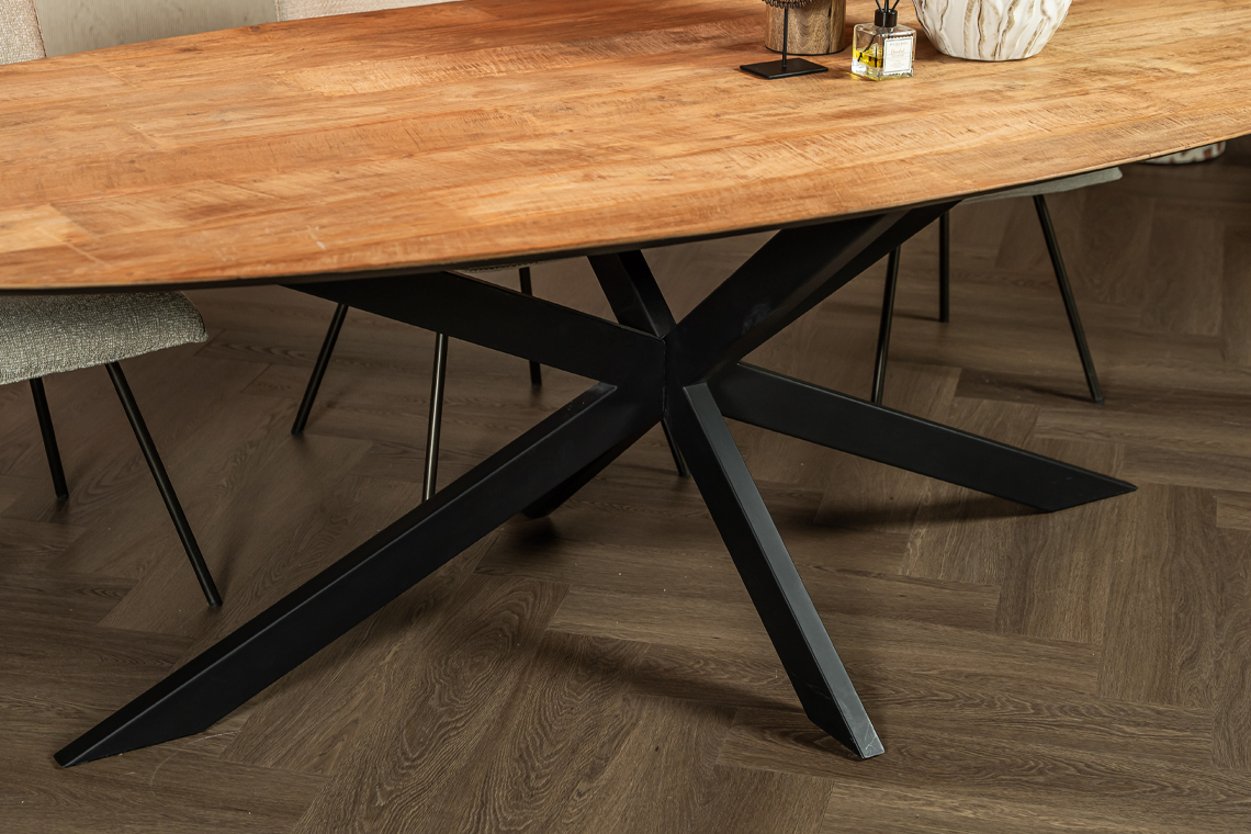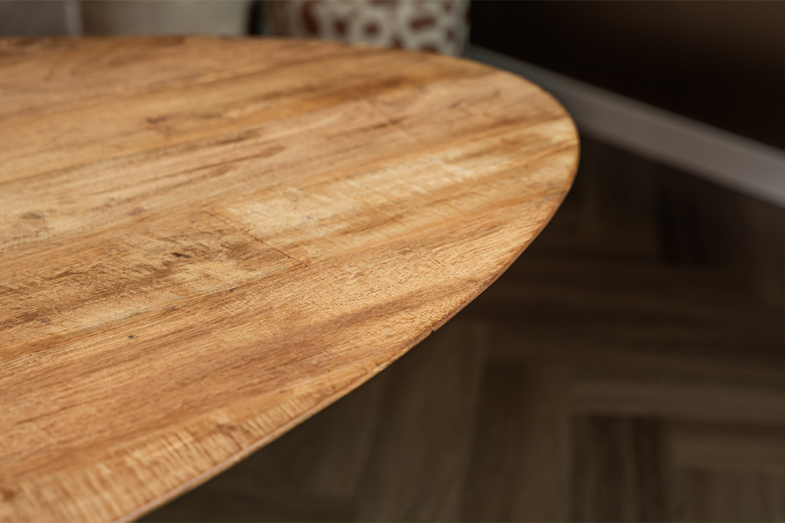 Wat de ovale eettafel bijzonder maakt, is de combinatie van het warme houten blad en de stevige metalen spinpoot. Doordat de tafel geen hoeken heeft, ontstaat er een speelse en elegante uitstraling die ideaal past in zowel moderne als klassieke interieurs. Net zoals bij andere designstukken vormt de ovale tafel het middelpunt van de eetkamer en nodigt hij uit om samen te genieten.