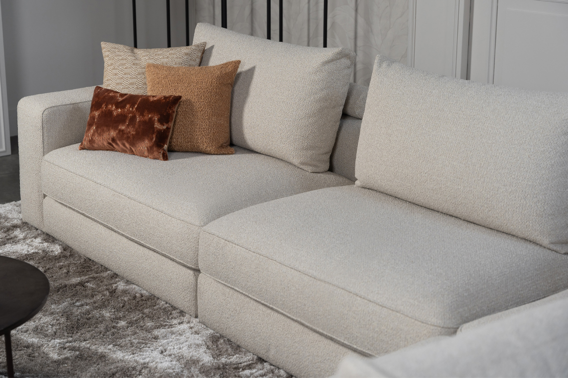 De Elementenbank Eva maakt in de eerste plaats indruk door haar royale uitstraling en zachte vormgeving. De ruime zitvlakken en comfortabele kussens zorgen voor een uitnodigend geheel dat rust en luxe uitstraalt. Daardoor voelt deze bank direct als het hart van de woonkamer. De lichte bekleding geeft een frisse en tijdloze basis, terwijl het ontwerp warmte en comfort uitademt.