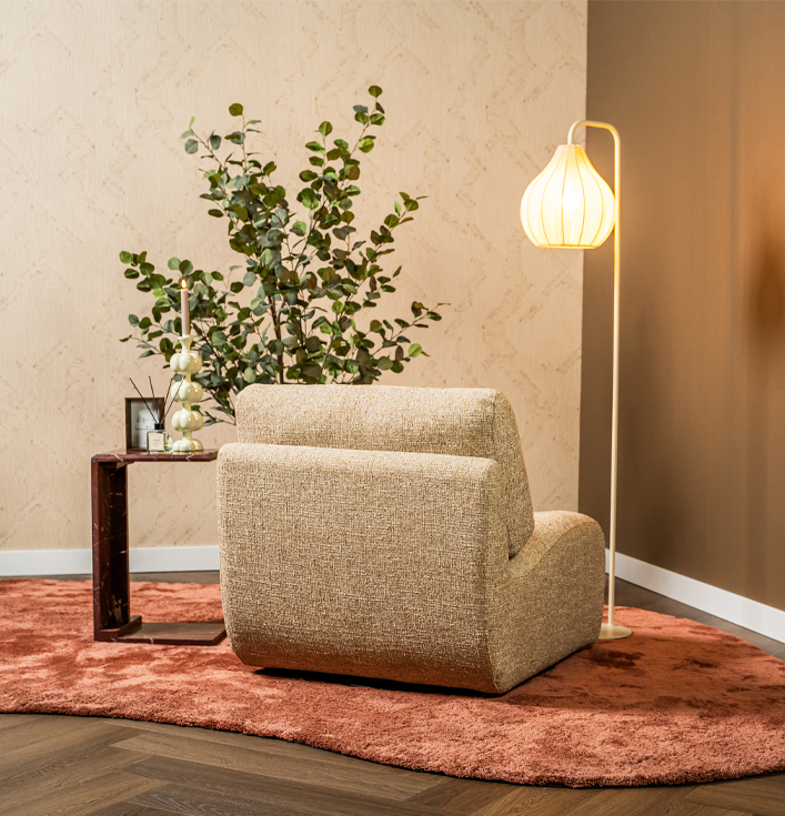 Daarnaast is combineren eenvoudig. In een modern interieur verzacht de Fauteuil Lucia taupe de strakke lijnen, omdat de ronde vormen voor balans zorgen. In een Scandinavisch of landelijk interieur versterkt hij juist het rustige en natuurlijke gevoel. Ten eerste ontstaat er meer harmonie, ten tweede oogt de ruimte warmer en uitnodigender door de zachte stof en kleur.