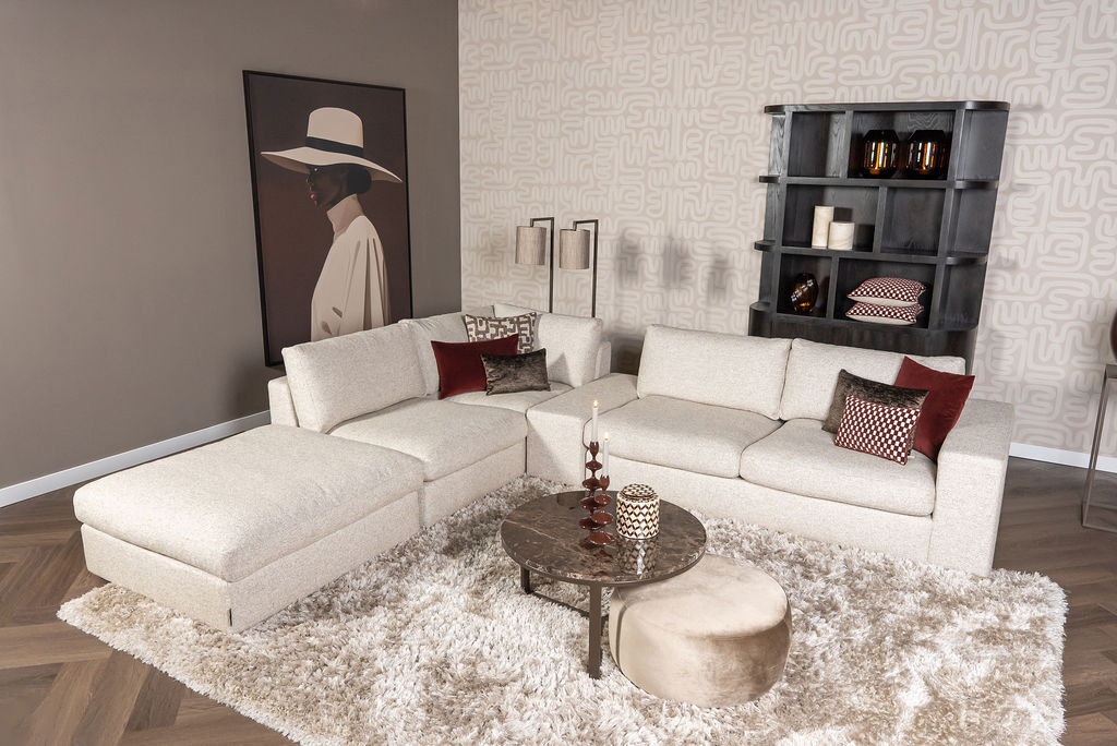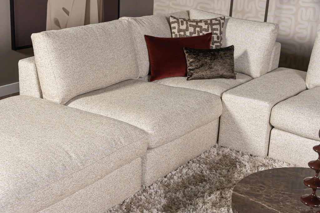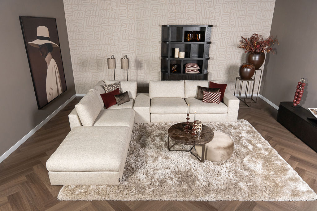 Ten eerste is de Hoekbank Victoria modulair opgebouwd. Dat betekent dat je de bank volledig zelf kunt samenstellen: in kleur, stof, opstelling én afwerking. Denk daarbij aan de populaire zadelstik-afwerking en een elegante uitstraling met zwart kunststof onderstel.