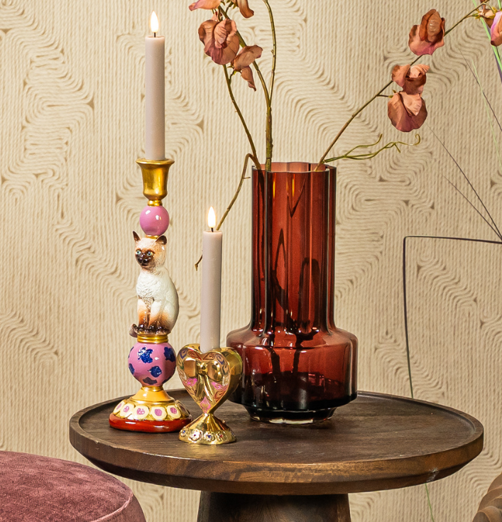 Daarnaast laat hij zich eenvoudig combineren met andere woonaccessoires. In een modern interieur zorgt de Kandelaar Bubbly Heart goud voor een speels contrast, omdat het hartvormige design de strakke lijnen doorbreekt. In een eclectisch of chic interieur versterkt hij juist het luxe gevoel. Ten eerste voeg je warmte toe, ten tweede krijgt de styling een persoonlijk en uniek karakter.