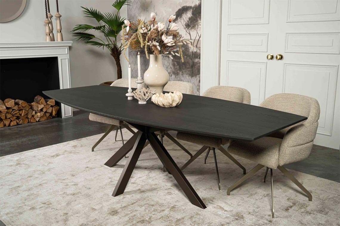 eettafel half ovaal zwart eikenhout met bruine metalen onderstel