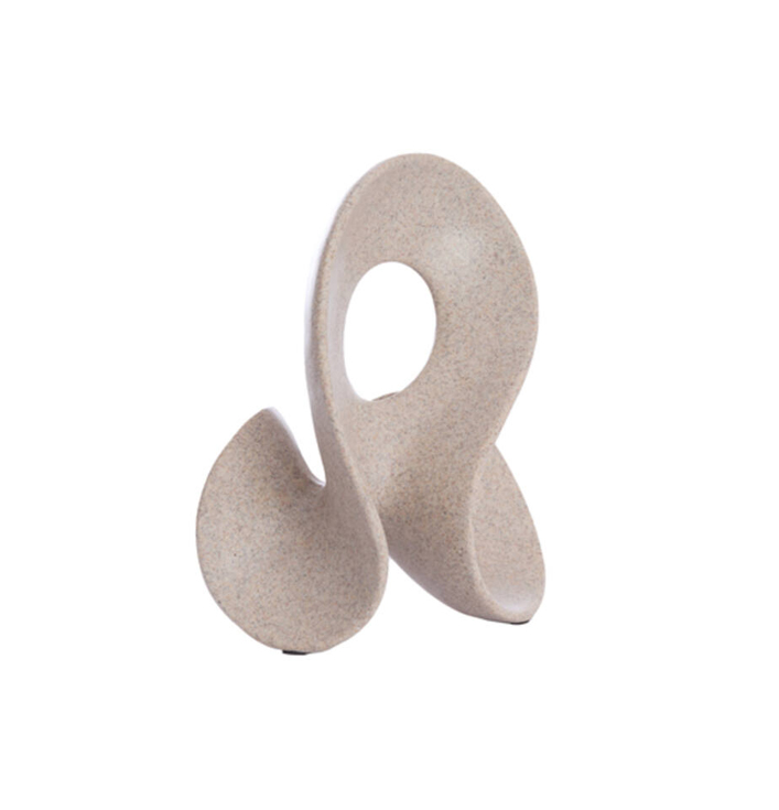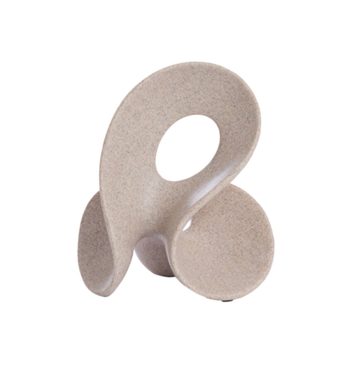 Ten eerste valt dit ornament direct op door zijn organische vorm met vloeiende lijnen en een centrale opening. Deze abstracte stijl maakt het object bijzonder geschikt als kunstzinnig accent in moderne interieurs. Daarnaast zorgt de zachte taupekleur voor een rustige uitstraling die gemakkelijk combineert met andere kleuren en materialen.