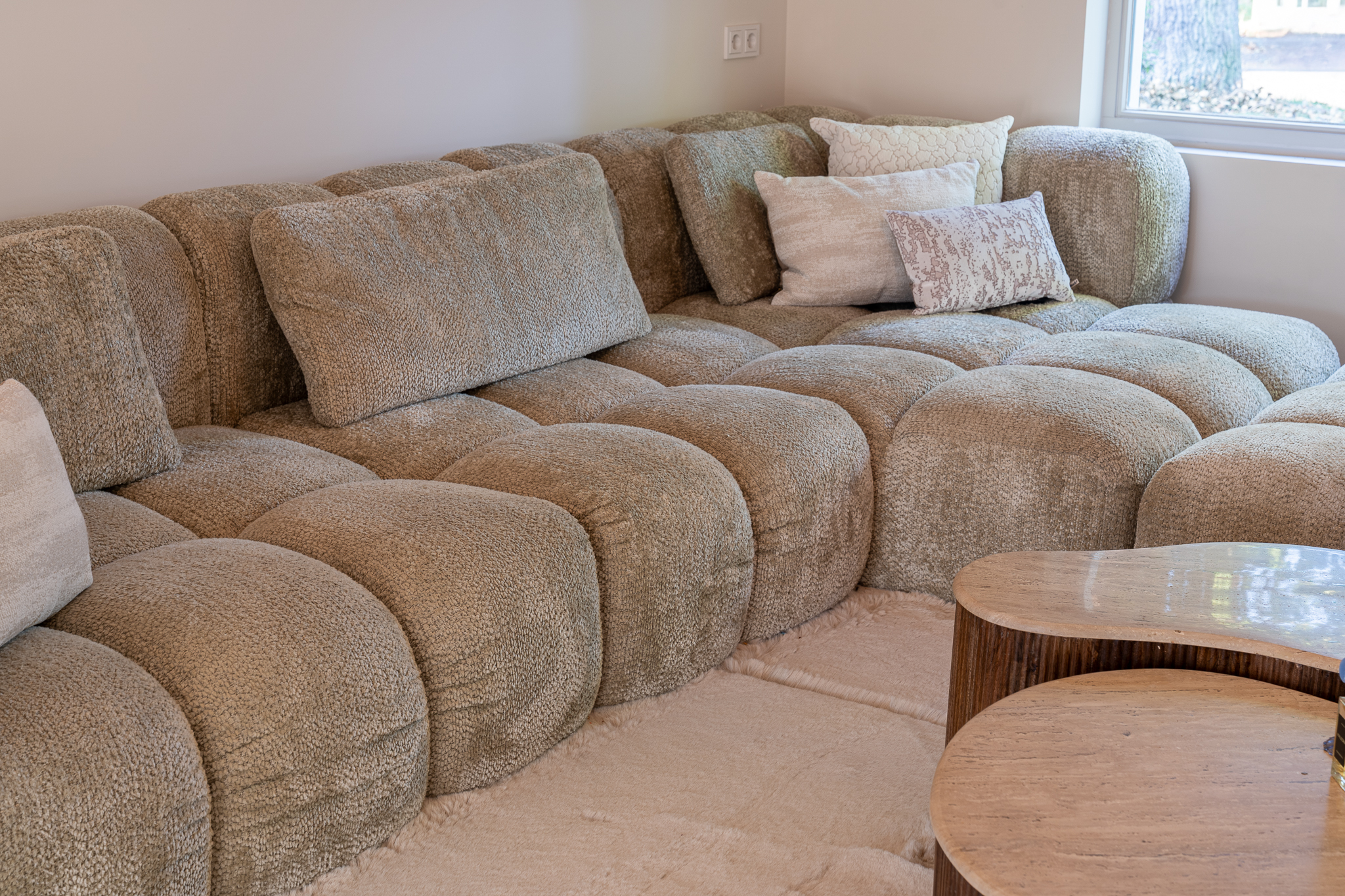 De zachte, royaal gevulde kussens van de hoekbank zorgen voor een comfortabele zit.