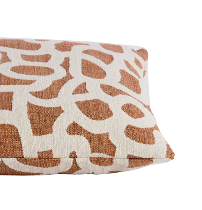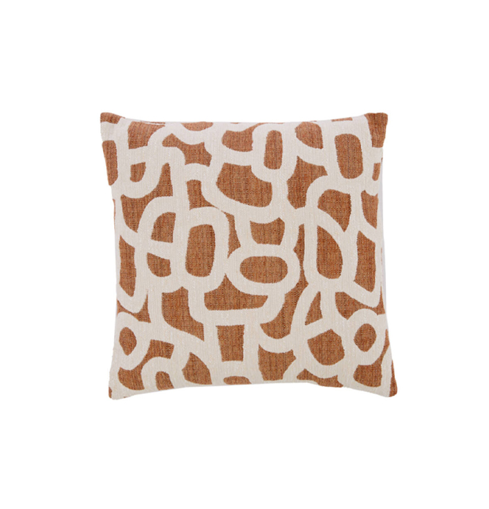 Ten eerste valt dit kussen op door zijn opvallende grafische patroon in terra en crème. Daarnaast zorgt de combinatie van de zachte stof en het speelse reliëf voor een luxe, maar gezellige uitstraling. Bovendien past de warme terrakleur uitstekend bij natuurlijke tinten en materialen, zoals hout, linnen en wol.