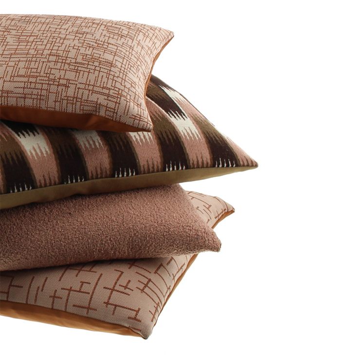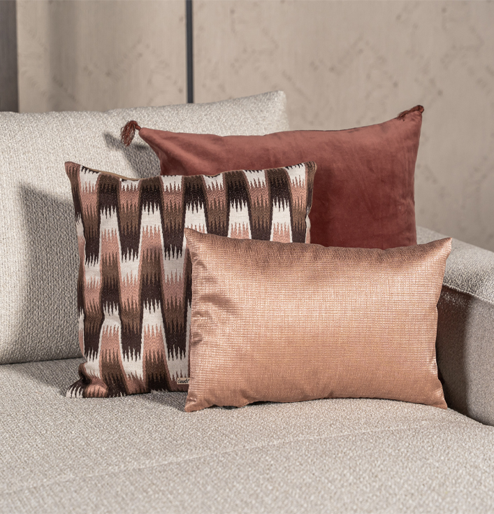 Ten eerste valt het kussen op door zijn ritmische zigzagdessin in warme aardetinten zoals bruin, roze en crème. Daarnaast zorgt de geweven textuur voor een rijk en kwalitatief gevoel. Bovendien is de hoes voorzien van een subtiele rits, wat het wisselen of reinigen vergemakkelijkt.
