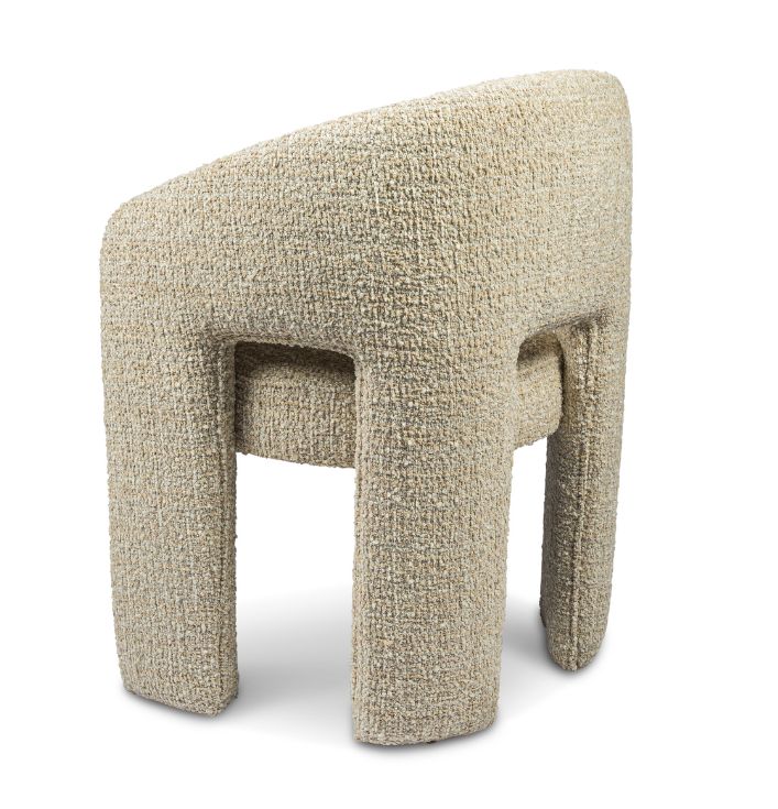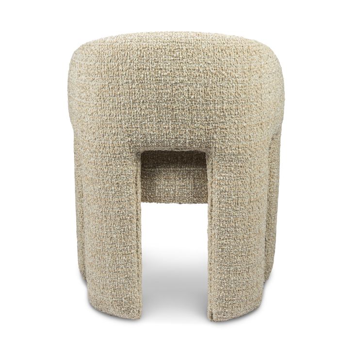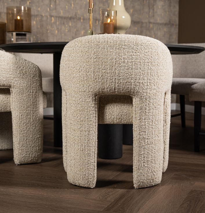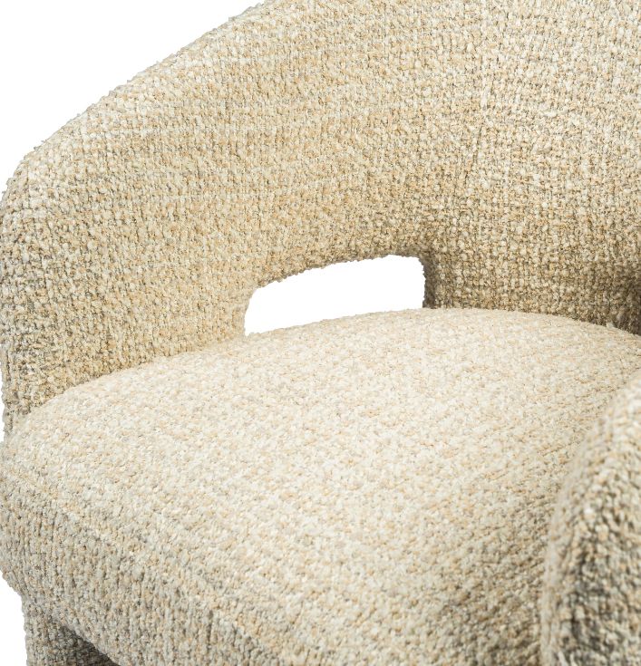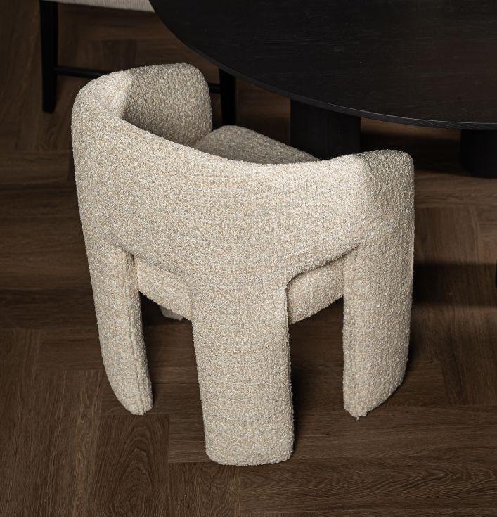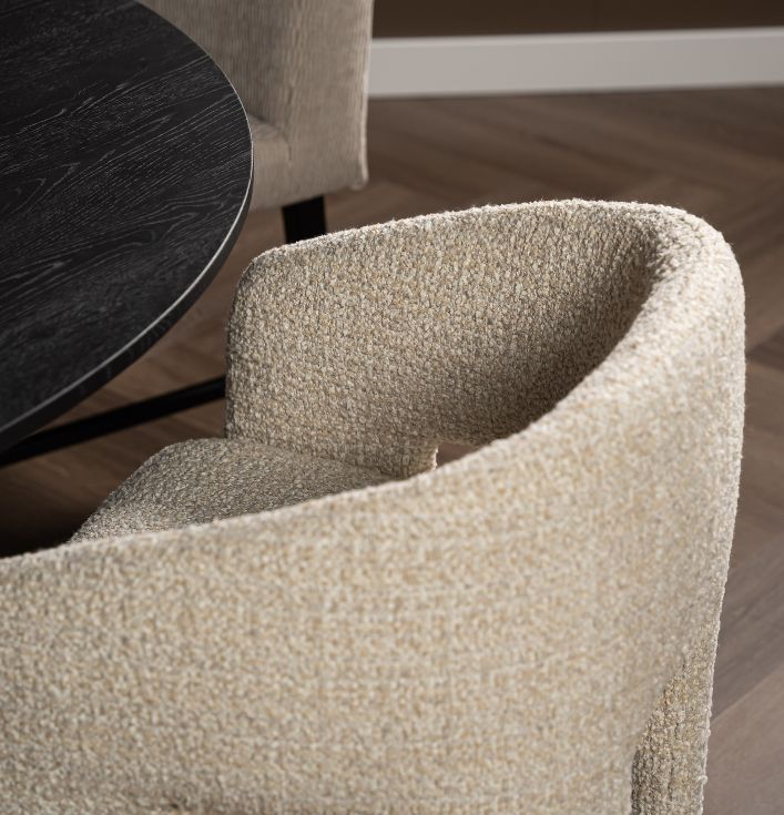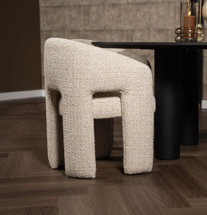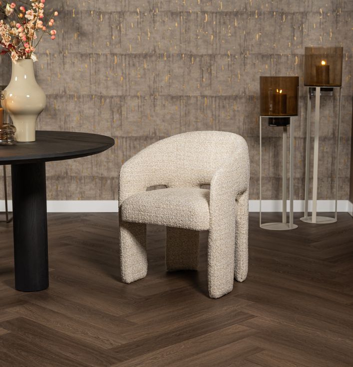 De Stoel Hamilton is ontworpen met een modern en uitnodigend silhouet. De zachte, bouclé stof zorgt voor een warme en comfortabele uitstraling, terwijl de ronde vormen het geheel een speelse, maar toch stijlvolle touch geven. Dankzij de neutrale kleurkeuze is de stoel eenvoudig te combineren met andere meubels en accessoires.