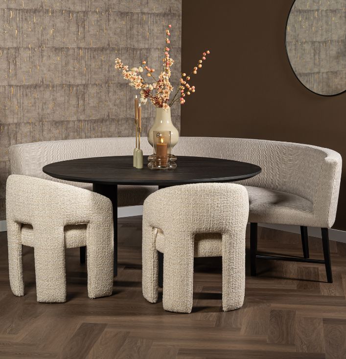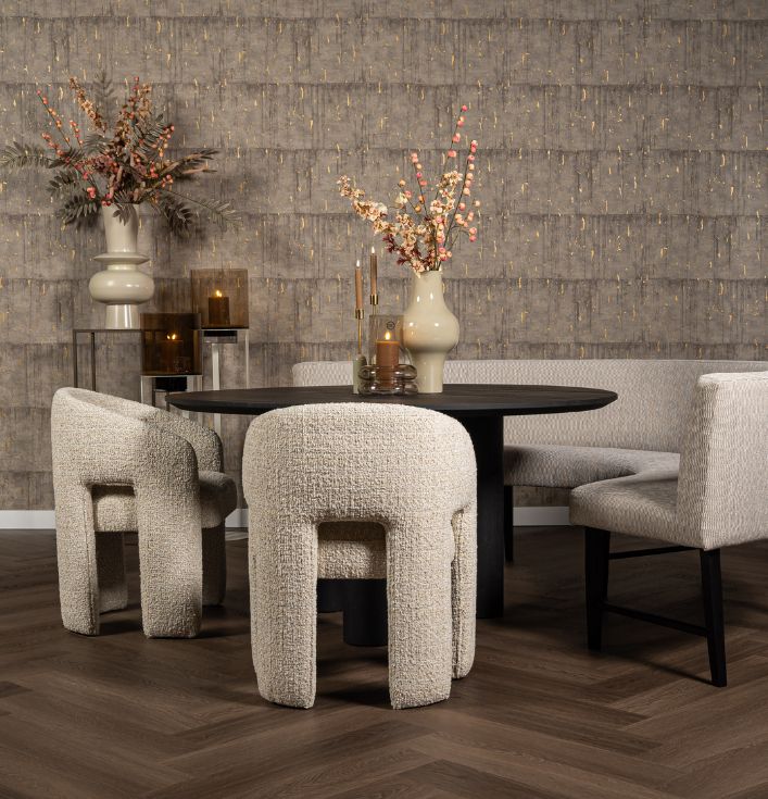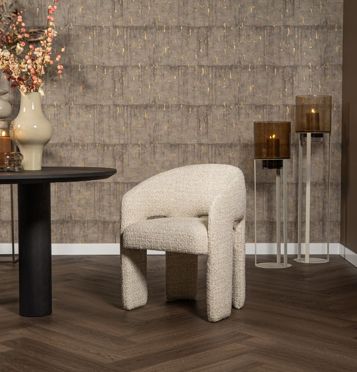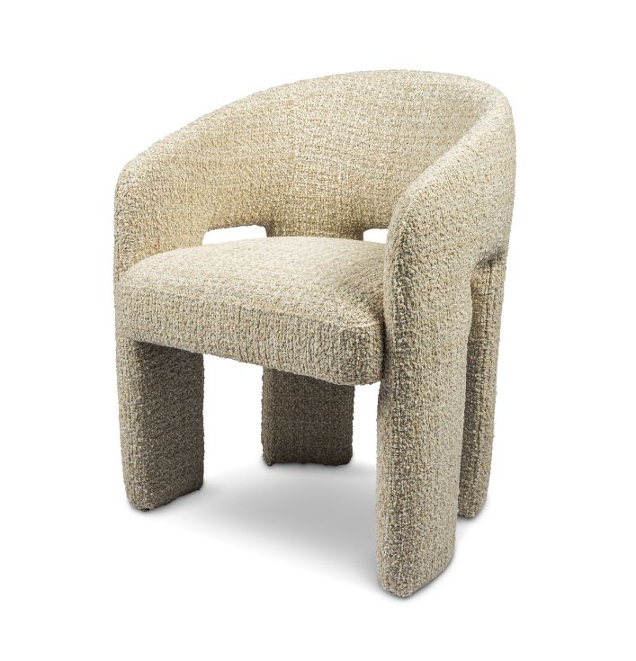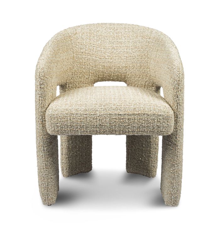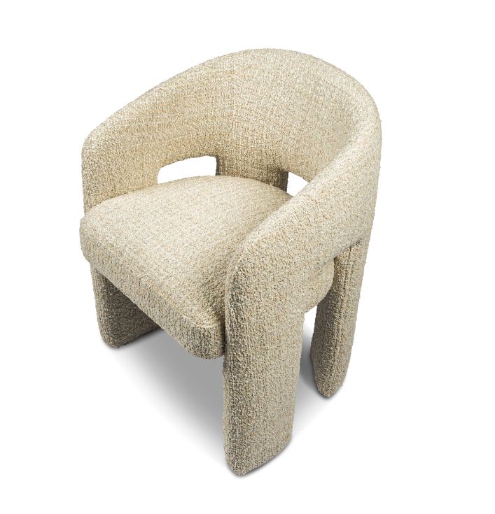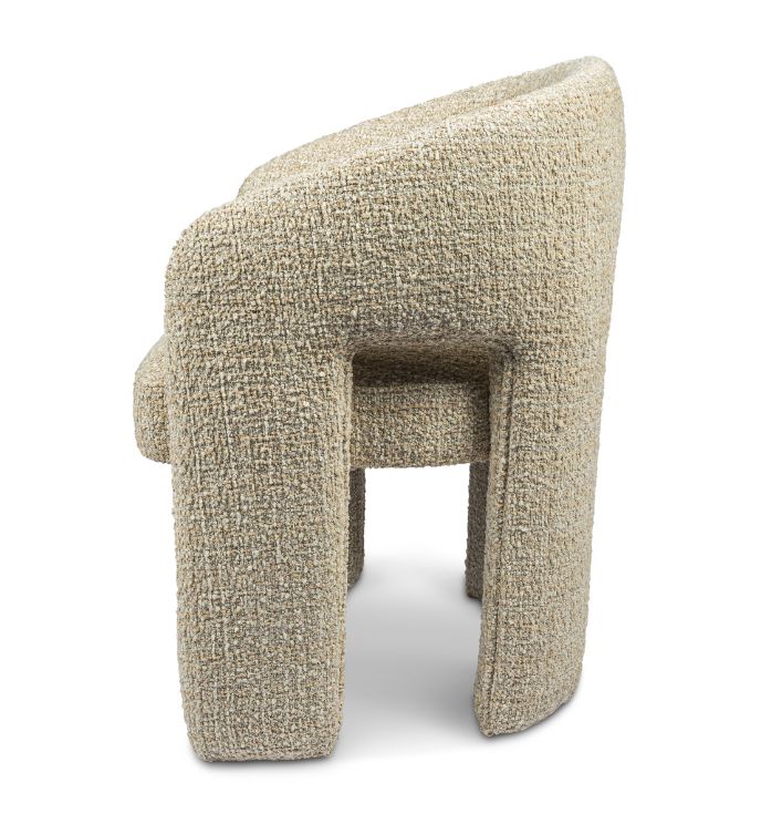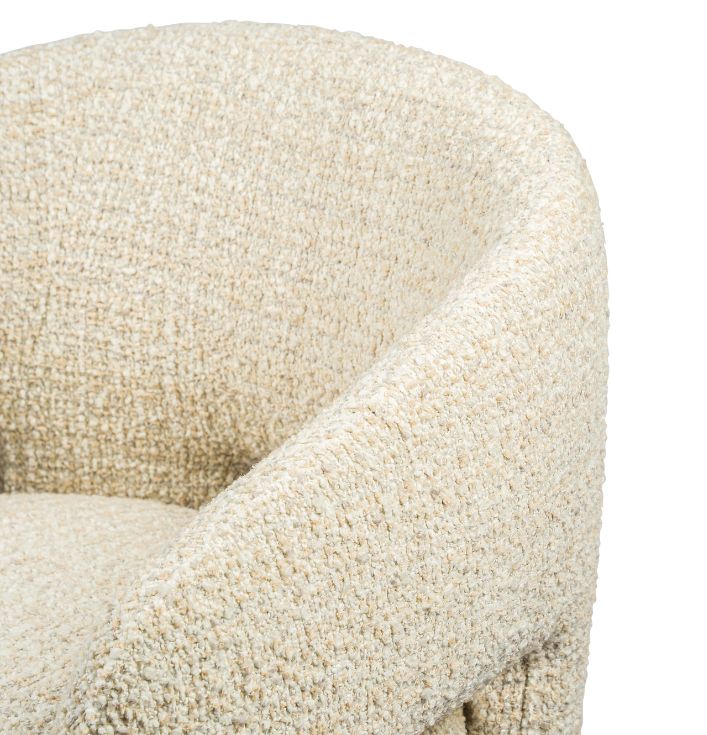De Stoel Hamilton is ontworpen met een modern en uitnodigend silhouet. De zachte, bouclé stof zorgt voor een warme en comfortabele uitstraling, terwijl de ronde vormen het geheel een speelse, maar toch stijlvolle touch geven. Dankzij de neutrale kleurkeuze is de stoel eenvoudig te combineren met andere meubels en accessoires.