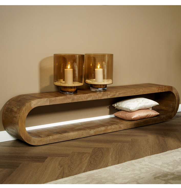 Het TV-meubel Elora bruin is een ware blikvanger in elke woonkamer. Dankzij de natuurlijke uitstraling en ovale vorm oogt het stijlvol én uniek. Of je nu houdt van een modern of natuurlijk interieur, dit meubelstuk past er perfect bij. Bovendien zorgt het warme mangohout voor een gezellige sfeer in huis.