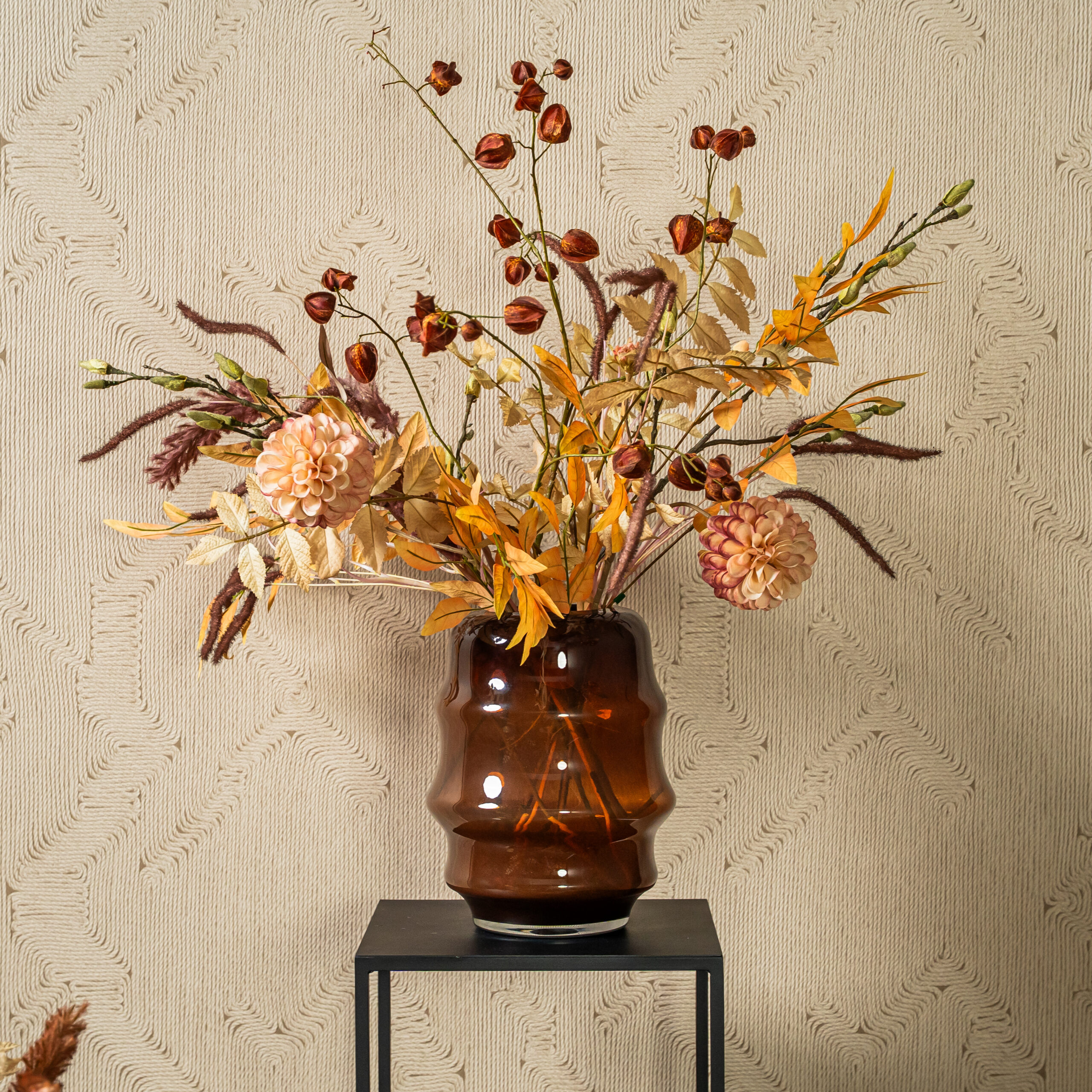 Daarnaast is combineren eenvoudig. In een modern interieur zorgt de Vaas Jamanota bruin voor warmte, omdat de kleur het strakke geheel verzacht. In een landelijk of bohemian interieur versterkt hij juist het natuurlijke karakter. Ten eerste ontstaat er meer balans, ten tweede oogt de styling rijker en gelaagder door het gebruik van glas en aardetinten.