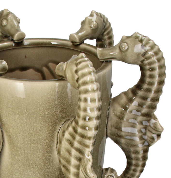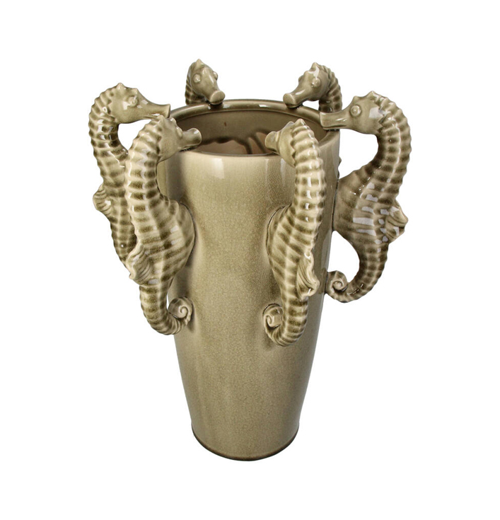 Laat je interieur opvallen met een unieke en speelse twist dankzij de Vaas Zeepaardjes beige. Deze bijzondere vaas combineert een elegante vorm met opvallende details: rondom de opening kronkelen meerdere zeepaardjes, zorgvuldig afgewerkt in een glanzende beige tint. Daardoor krijgt de vaas een eigenzinnige én luxueuze uitstraling. Ideaal voor wie houdt van maritieme invloeden met een decoratieve knipoog.