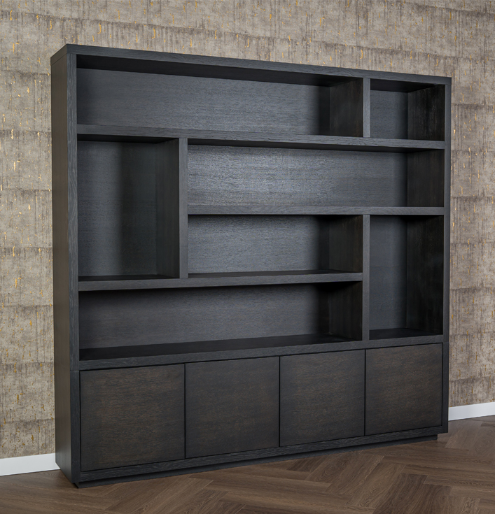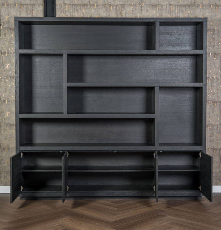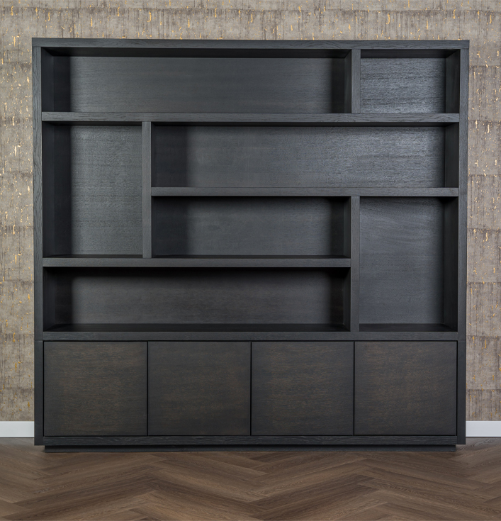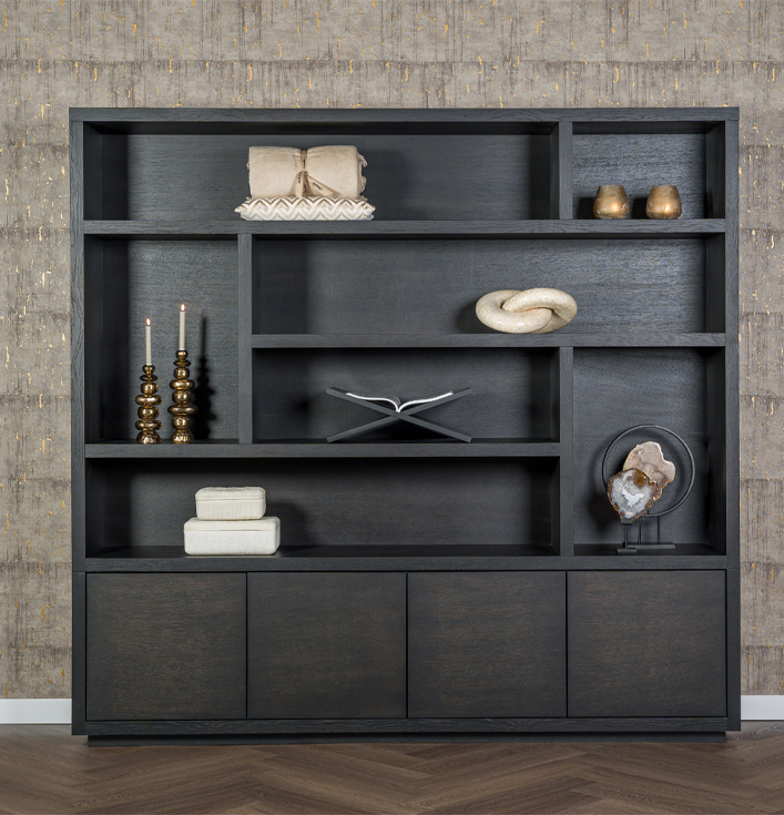 Ten eerste is het ontwerp van deze kast gebaseerd op geometrische eenvoud met een verrassend speels lijnenspel. De open vakken in verschillende formaten bieden volop ruimte voor boeken, accessoires en decoratieve objecten. Daarnaast beschikt de onderzijde over vier gesloten kastdeuren, perfect om spullen netjes op te bergen die niet in het zicht hoeven.