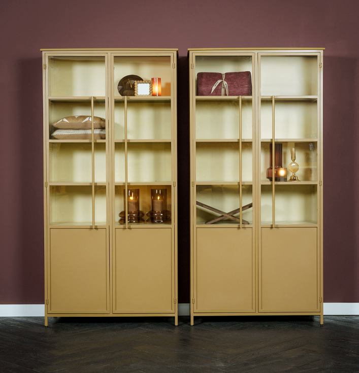 Deze vitrinekast heeft een opvallende gele kleur die direct sfeer toevoegt. Daarnaast is hij gemaakt van stevig metaal en glas. Doordat de glazen deuren een open uitstraling geven, blijven je mooiste accessoires altijd zichtbaar.