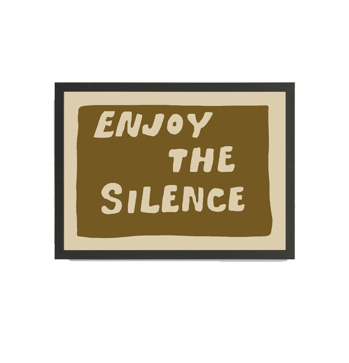 Ten eerste valt de eenvoudige tekst “Enjoy The Silence” direct op. De krachtige boodschap spreekt voor zich en nodigt uit tot ontspanning. Daarnaast zorgt de groene achtergrond voor een natuurlijke, kalmerende uitstraling, terwijl de lichte omlijsting en donkere lijst voor een mooi contrast zorgen. Bovendien past dit ontwerp perfect in zowel moderne als minimalistische interieurs.