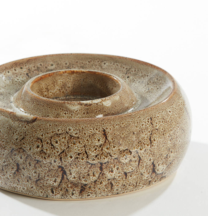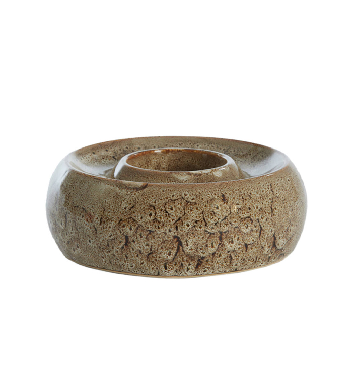 Ten eerste is het glazuur van deze waxinelichthouder afgewerkt in een bruin-beige tint met karakteristieke textuur. Daarnaast zorgt het ronde, compacte design ervoor dat de houder stevig staat, waardoor hij ideaal is voor op salontafels, vensterbanken of een dressoir.