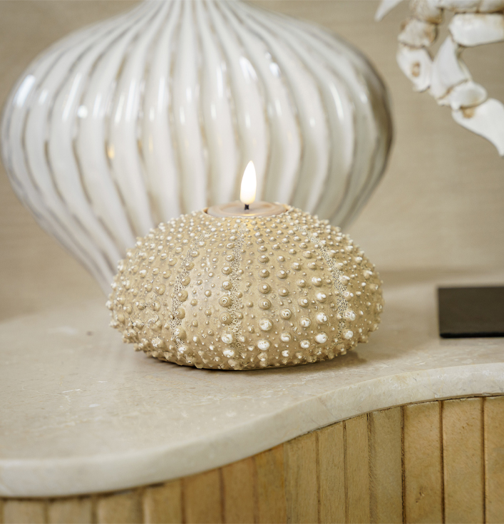 Voeg een vleugje kustsfeer toe aan je interieur met de Waxinelichthouder Sea Urchin zand. Deze sfeervolle houder is geïnspireerd op de natuurlijke vorm van een zee-egel, met een realistisch reliëf en een zachte zandkleur. Daardoor straalt hij rust en elegantie uit – perfect voor wie houdt van maritieme details met een verfijnde uitstraling.